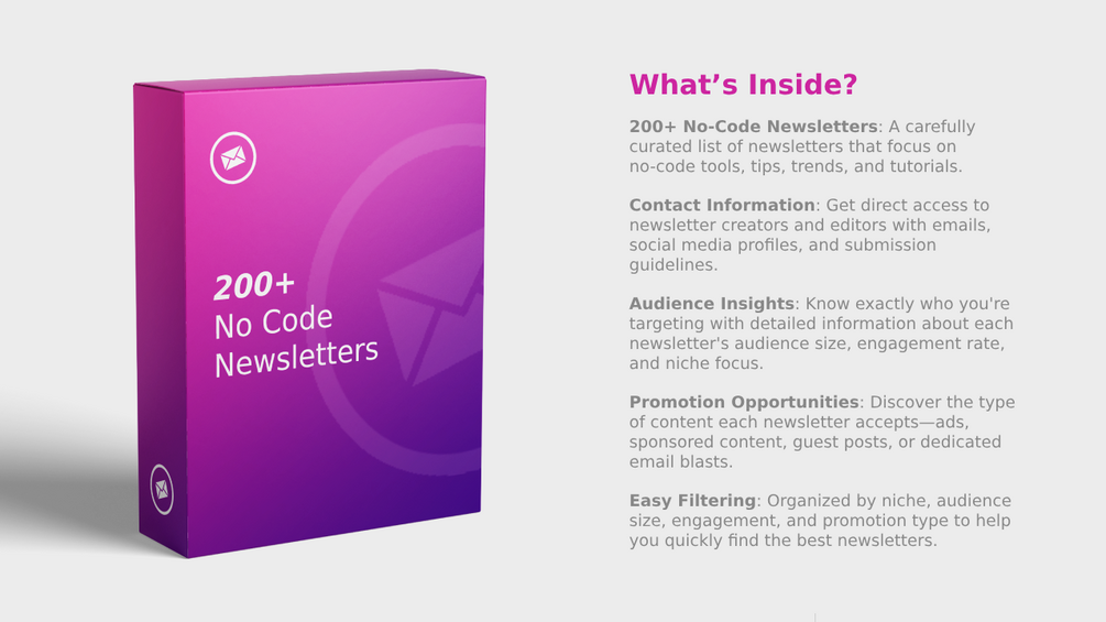 Unlock the power of targeted marketing with our Ultimate No-Code Newsletter Database—a curated collection of 200+ newsletters in the no-code space, specifically designed to help you promote your product or service!