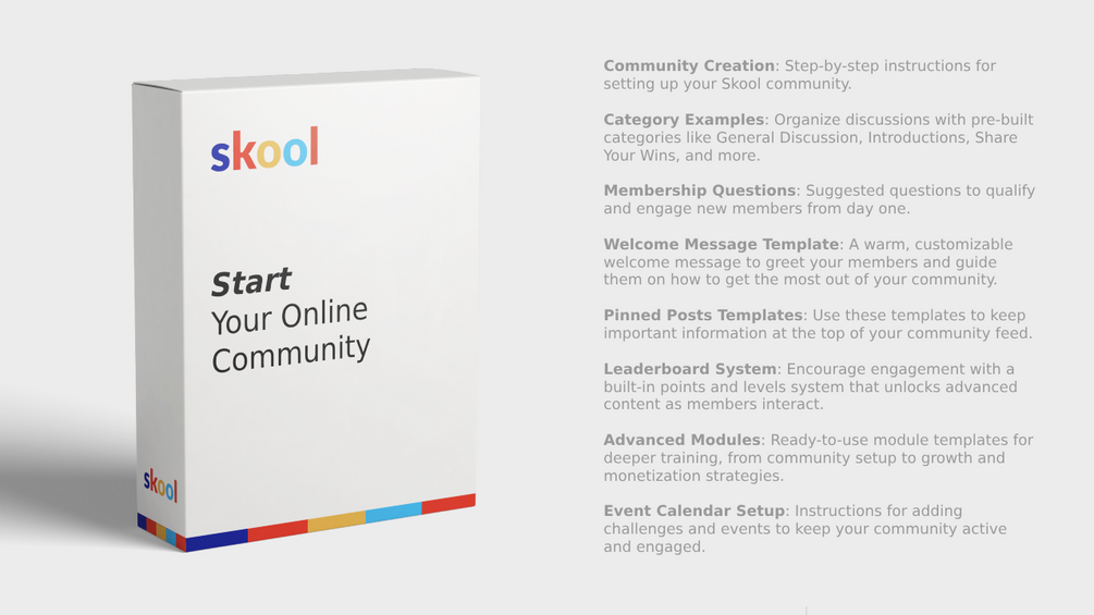 - Community Creation: Step-by-step instructions for setting up your Skool community, including adding a cover photo, community icon, and crafting a compelling description.